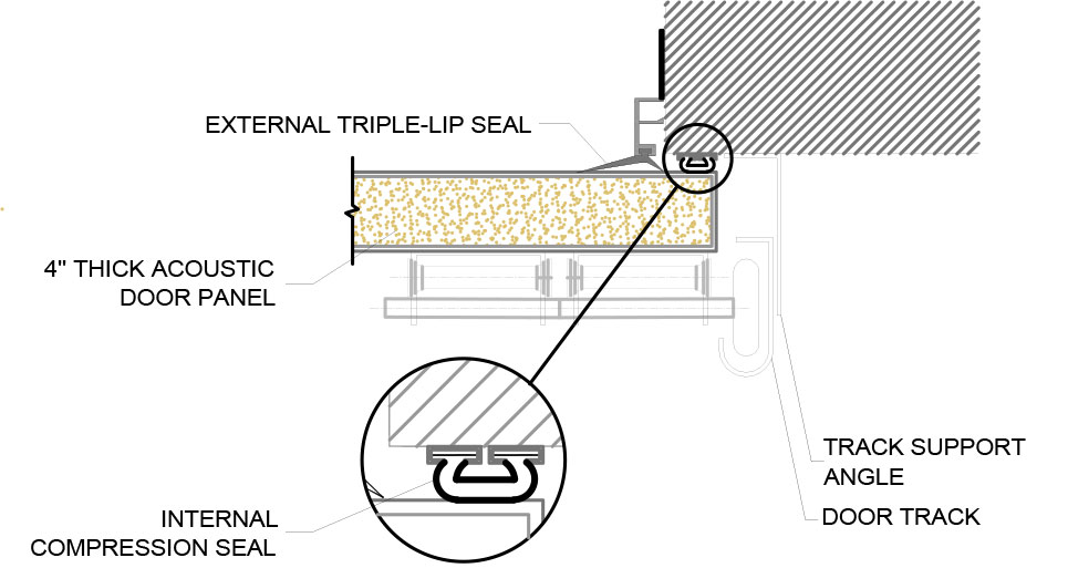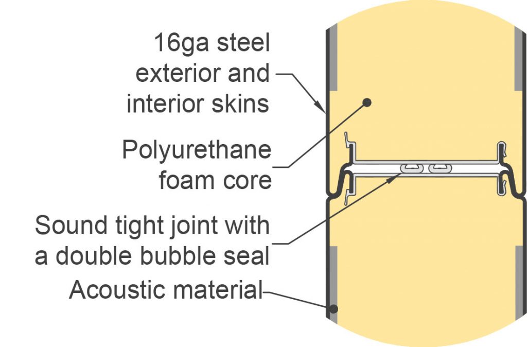 The SoundSentry STC 40 acoustic sectional door conforms to the ASTM E-413 (Classification for Rating Sound Insulation) standard and is equipped with 16 gauge steel skins over a 4” thick acoustic material and high density polyurethane foam core. Thus, the SoundSentry STC 40 acoustic vertical door is also a heavy-duty security sectional door with a superior R-32 insulation value. It is a superior quality acoustic vertical door with the following remarkable features: high density polyurethane foam core, sound-tight tongue-and-groove joint, panel joint integral double bubble seal, triple-lip perimeter weather seal, wall acoustic compression seal, double U-rubber bottom seal and 16 gauge galvanized steel end caps. The door can be manually operated with a chain hoist or can be motorized with electrical accessories. The SoundSentry STC 40 has a smooth finish and is enamel painted with a choice of color based on the RAL color chart.