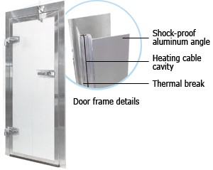 For freezer applications, the door is equipped with a heat trace on four (4) sides of the door, preventing ice or frost accumulation and eliminating the need to have a heated threshold.