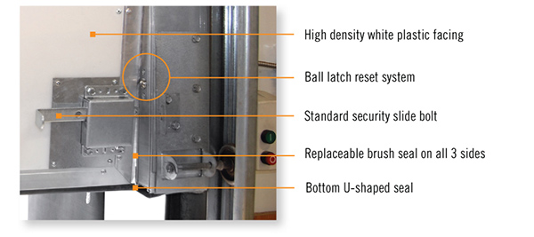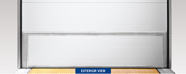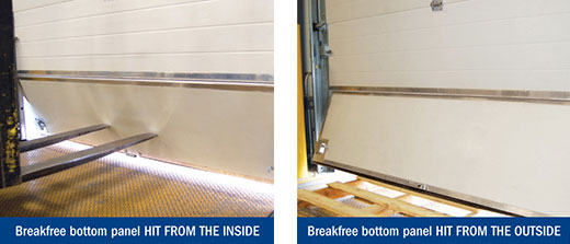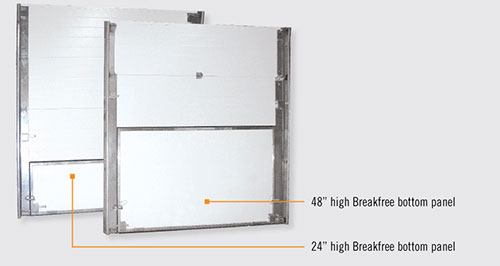 The Breakfree protection feature allows Thermostop’s Mark II (2” thick, R-18.2), Mark III (3” thick, R-24) and Mark IV (4” thick, R-32) polyurethane foam insulated doors to be equipped with a breakaway bottom panel. Thus, when outfitted with the Breakfree protection bottom panel, the Thermostop industrial sectional doors can become impactable doors by having the capability of releasing the breakaway bottom panel upon impact. As the knockout Breakfree protection bottom panel is made with the same metal skin and the same thickness as the rest of the door, the door’s exterior appearance and insulation performance will be maintained. Thermostop’s airtight 2”, 3” and 4” thick industrial doors, outfitted with the bottom Breakfree protection panel, are equipped with a panel joint bubble seal (two bubble seals for 3” and 4” thick doors), a robust triple-lip perimeter weather seal and a U-rubber bottom seal (two U-rubber bottom seals for 3” and 4” thick doors).