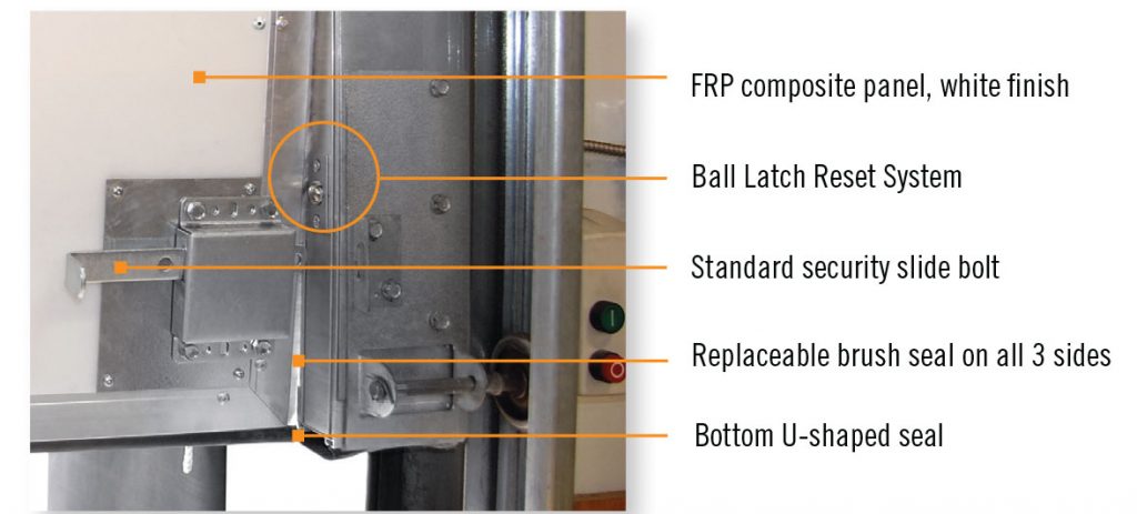 This Breakfree 400 cooler door is designed to release the bottom section upon impact, either outward or inward, and to easily set the section right back into place. The 4″ thick expanded polystyrene (EPS) insulated knockout bottom section, in 30″ or 48″ heights, is made of an extremely resistant thermoplastic composite skin that can withstand heavy impacts.