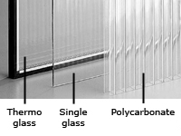 Glazing sealed with watertight closed-cell foam tape and securely retained in place with a rigid vinyl snap-on moulding.